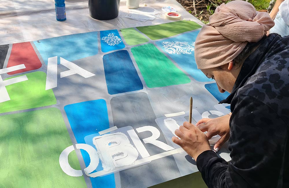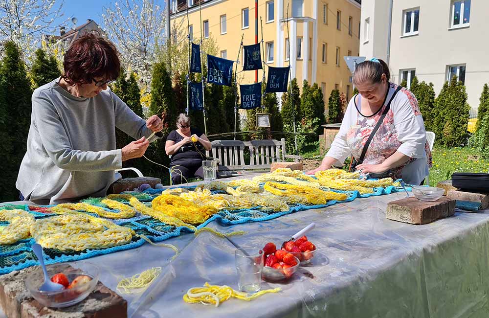 Seit April 2026 arbeiten wir jeden Samstag im YOSEFA Frauengarten an der Erweiterung unserer Ausstellung SANCTUM. Die entstandenen Werke werden wir ab voraussichtlich August an Bäumen, Zäunen und Fassaden als Freiluftgalerie rund um den Oberhauser Friedensplatz präsentieren.